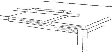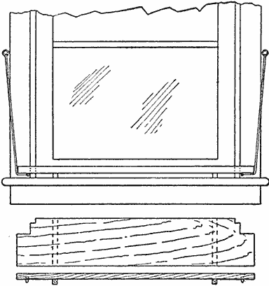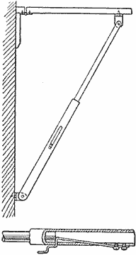 The supporting arm of the hinged shelf is constructed of a piece of gas pipe and a length of iron rod which slides snugly into the pipe. A spring catch is set in the pipe at the proper height to engage the end of the iron rod when the shelf is up. This spring must be of good size, as it holds the entire weight of the shelf. A large clock spring is suitable. One end of the spring is bent outward and upward to form a releasing handle. The other end is drilled for the two machine screws which hold it to the pipe. The spring works in a rectangular slot, cut lengthwise of the pipe. The pipe must extend 8 or 10 in. beyond the spring. The ends of the rod and of the pipe are pivoted with screws or rivets on angle pieces screwed to the shelf and wall.—Contributed by Donald A. Price, Wilmington, Del.