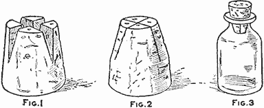 The secret of the trick consists in the use of two covers, two bottles and two glasses, and the manner of performing it is as follows: The bottles are bottomless and of such size as to admit the glass without sticking. A round hole is cut in one side of each bottle, about 2-1/2 in. above the bottom. This can be accomplished in a drill press by using a round copper tube, with fine emery applied to its end, as a drill. The hole should be so placed that a finger will strike the top of the glass when both bottle and glass are set on the same surface. If dark-colored bottles are used, a false bottom can be made and fitted in each bottle above the upper edge of the glass. This bottom can be cemented in place and made liquid-tight, so that some wine may be placed in the bottle and poured into the opposite glass to show that it holds liquid. In doing this part of the trick, make no more changes with the wine in one glass.
