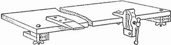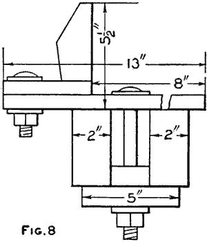One table is used for the circular saw, planer head, sander, and jig saw, and it is attached on top of the headstock and tailstock standards with bolts, run through the back edge of the board and the ends of two brackets which are screwed to the back edge of the inner standards. Thumb nuts are used on the bolts to aid in making the change quickly. More than one hole is provided in the back edge of the board, so that the tailstock bracket can occupy the right position for the sander or planer head, as the case may be. The holes in the bracket ends should be somewhat larger than the bolt, to allow tilting of the table. An adjusting screw is substituted for the rest, so that the table can be raised or lowered to suit the work in hand.