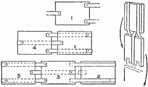 In constructing a box I needed a hinge that would carry the cover farther away from the top than the ordinary double-leaf hinge. I found that two pieces of 1/4 by 5/8-in. wrought iron, attached in the manner shown, answered the purpose. By using round-head screws it was unnecessary to countersink the metal.—Contributed by James M. Kane, Doylestown, Pa.
