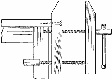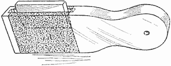 In using a plain scraper on the surface of wood the task grew exceedingly tiresome and I lightened the tedious work to some extent by making a handle for the scraper. The handle consisted of a piece of wood, 1 in. thick, 3 in. wide, and 6 in. long. A cut was made in the edge of the wood the width of the scraper blade and about 3 in. deep, and a bolt run through a hole bored centrally in the side, about 2-1/2 in. from the lower edge. The blade was clamped in place with the bolt.—Contributed by J. D. Keiley, Yonkers, New York.