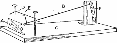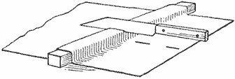 In place of the two needles and the ruler described for marking the line of sight, most plane-table men use an alidade, which is a combination of two sights and a straightedge. A very simple alidade may be made by mounting two needles on a ruler. The straight edge of the ruler is placed against the needle which marks the station at which the plane table is set up. Then, by swinging the ruler around this needle until its two sighting needles come in line with some object, the line of sight can be drawn directly on the paper along the edge of the ruler. A surveyor in India once made an alidade out of a piece of straightedge and two sights made of native coins hammered out by a native blacksmith. Two pieces of cigar box, one with a fine vertical saw slit in it, and the other with a vertical slot and a piece of fine wire or silk thread stretched down the center, glued to a well planed, straight, flat piece of wood, make a fine alidade. A careful worker may be able to put his sights on hinges so that they will fold down when not in use.
