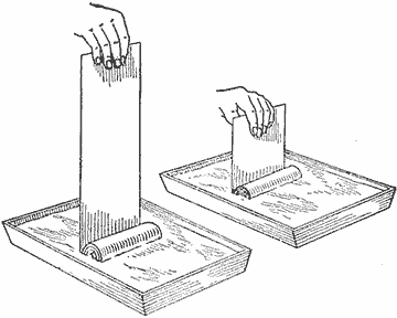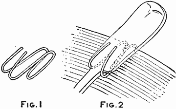 The stylus may be any kind of a pencil-like instrument, easy to grip between the fingers, with a hard, smooth point, rounded slightly so that it will not cut the paper. The ordinary bone stiletto, used in embroidering, makes an ideal tool for this purpose. If this is not to be had, a substitute is easily whittled from a piece of hard wood. Even a wire nail, with its point smoothed with a file, may be used, the upper portion being wound with string to afford a better grip.