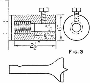 The planer head is made of a wood block, 9 in. long and 2-3/4 in. square. A 3/8-in. hole is bored through one way near each end, as shown in the drawing, and two steel knives, with 1/2-in. holes coinciding with the 3/8-in. holes in the wood, are made and attached with their edges opposite or projecting diagonally from the corners. The holes in the knives being larger than the bolts, makes the knives adjustable for setting the cutting edges. These knives may be made from an old saw blade, ground to size and one edge beveled and sharpened. A brass plate, with holes to fit the spur center, is fastened in the center of the block, on one end, and the other is centered for the cup of the tailstock screw. The adjusting screw for the table is used to regulate the cut.