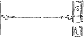 This latch is suitable for outbuildings, small shops and sheds, as it can be opened from both sides of the door and is easily applied. It consists of a rod of suitable size which is bent in the shape shown in the sketch after the rod is inserted through a hole bored near the edge of the door. The spring of the metal will hold the catch in place.