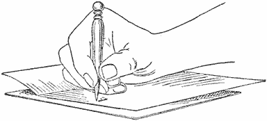 The pattern is now laid aside until required for transferring the design to another sheet of writing paper. Lay the blotter on some smooth, hard surface, such as a desk leaf or table top and lay the writing paper on the blotter, reversed design uppermost. Hold the stylus firmly at an angle as shown in the illustration and keep the blotter and paper from moving with the other hand. Carefully trace the design, using considerable pressure to insure a good relief upon the opposite side of the paper. A soft eraser should be used to remove the guide marks on the back of the sheet when the relief is finished.