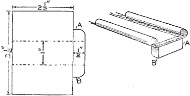 The method of using the thumb as a gauge on a rule in scribing long boards is not always satisfactory, especially if the board has a rough edge. It is always best to have a regular gauge, but in the absence of one, an attachment for an ordinary carpenter's rule can be quickly made from a piece of tin, although one made of sheet brass is better, in appearance as well as for service. Cut out the metal, as shown by the dimensions, and roll the two sides up, stopping at the dotted lines. The ends A and B are turned out slightly so that they will slide easily along the edge of the board. The gauge will snap on a rule easily and will stay where it is placed.—Contributed by H. J. Blacklidge, San Rafael, Cal.