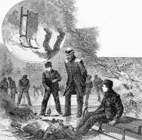 All wide-awake boys who know the pleasures of skating will agree with me that however cold and stormy it is upon the hill-tops, the mill-pond (and what does a village amount to without a mill-pond, indeed?) is always down in the coziest nook between the hills, where the winds can't come with more force than is needed to blow the falling flakes across its smooth surface, piling them in great heaps among the bordering willows, and leaving the ice in tempting order for "shinny."