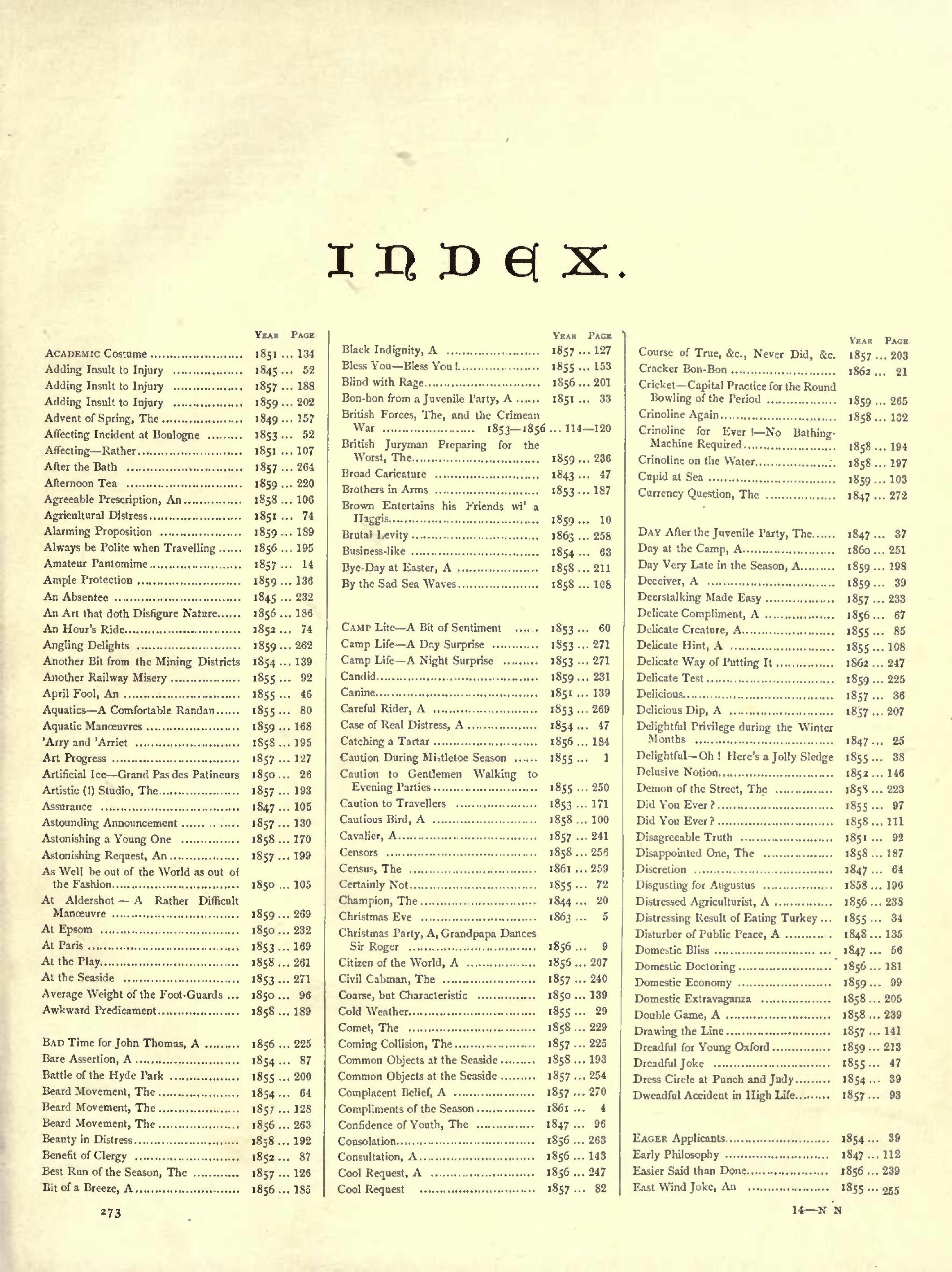 Camp Lite-A Bit of Sentiment...........................1853...060 Camp Life-A Day Surprise ..............................1853...271 Camp Life-A Night Surprise ............................1853...271 Candid.................................................1859...231 Canine.................................................1851...139 Careful Rider, A ......................................1853...269 Case of Real Distress, A...............................1854...047 Catching a Tartar......................................1856...184 Caution to Gentlemen Walking to Evening Parlies........1855...250 Caution to Travellers .................................1853...171 CautiouS Bird, A ......................................1858...100 Cavalier, A............................................1857...241 Censors ...............................................1858...256 Census, The ...........................................1861...259 Certainly Not..........................................1S55...072 Champion, The..........................................1844...020 Christmas Eve .........................................1863...005 Christmas Party, A, Grandpapa Dances Sir Roger ........1856...009 Citizen of the World, A ...............................1855...207 Civil Cabman, The .....................................1857...240 Coarse, but Characteristic ............................1S50...139 Cold Wealher...........................................1855...029 Comet, The ............................................1858...229 Coming Collision, The..................................1857...225 Common Objects at the Seaside..........................1858...193 Common Objects at the Seaside..........................1857...254 Complacent Belief, A ..................................1857...270 Compliments of the Season..............................1861...004 Confidence of Youth, The ..............................1847...096 Consolation............................................1856...263 Consultation, A........................................1856...143 Cool Request, A .......................................1856...247 Cool Request ..........................................1857...082 Course of True, &c., Never Did, &c.....................1857...203 Cracker Bon-Bon........................................1862...021 Cricket-Capital Practice Bowling of the Period ........1859...265 Crinoline Again........................................1858...132 Crinoline for Ever!—No Bathing-Machine Required.......1858...194 Crinoline on the Water.................................1858...197 Cupid at Sea ..........................................1859...103 Currency Question, The ................................1847...272