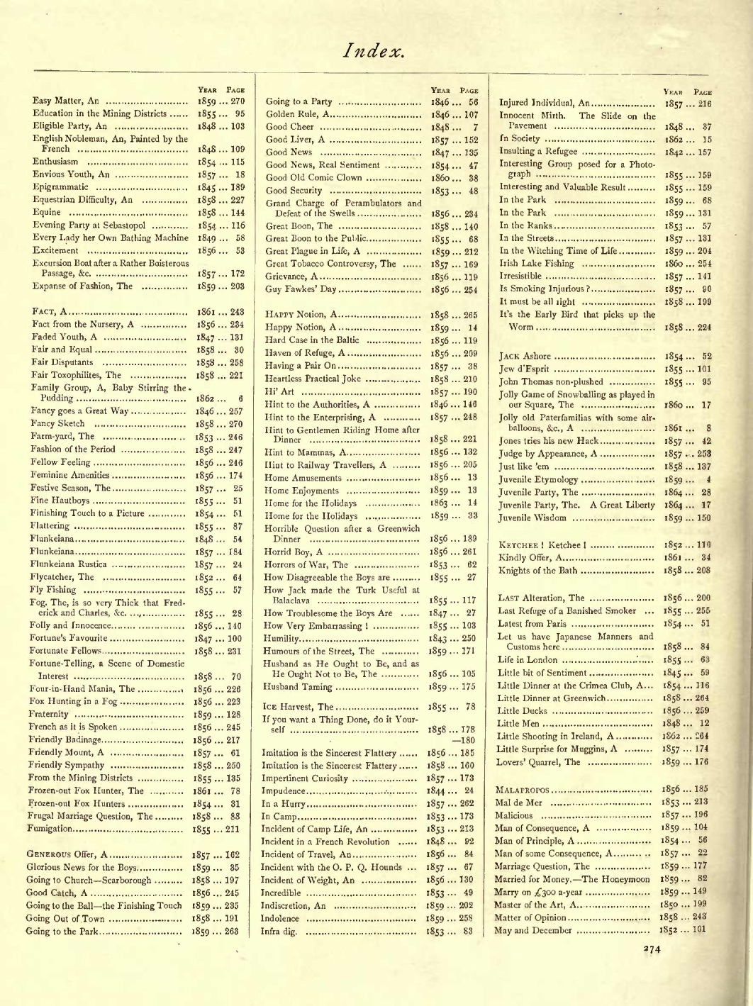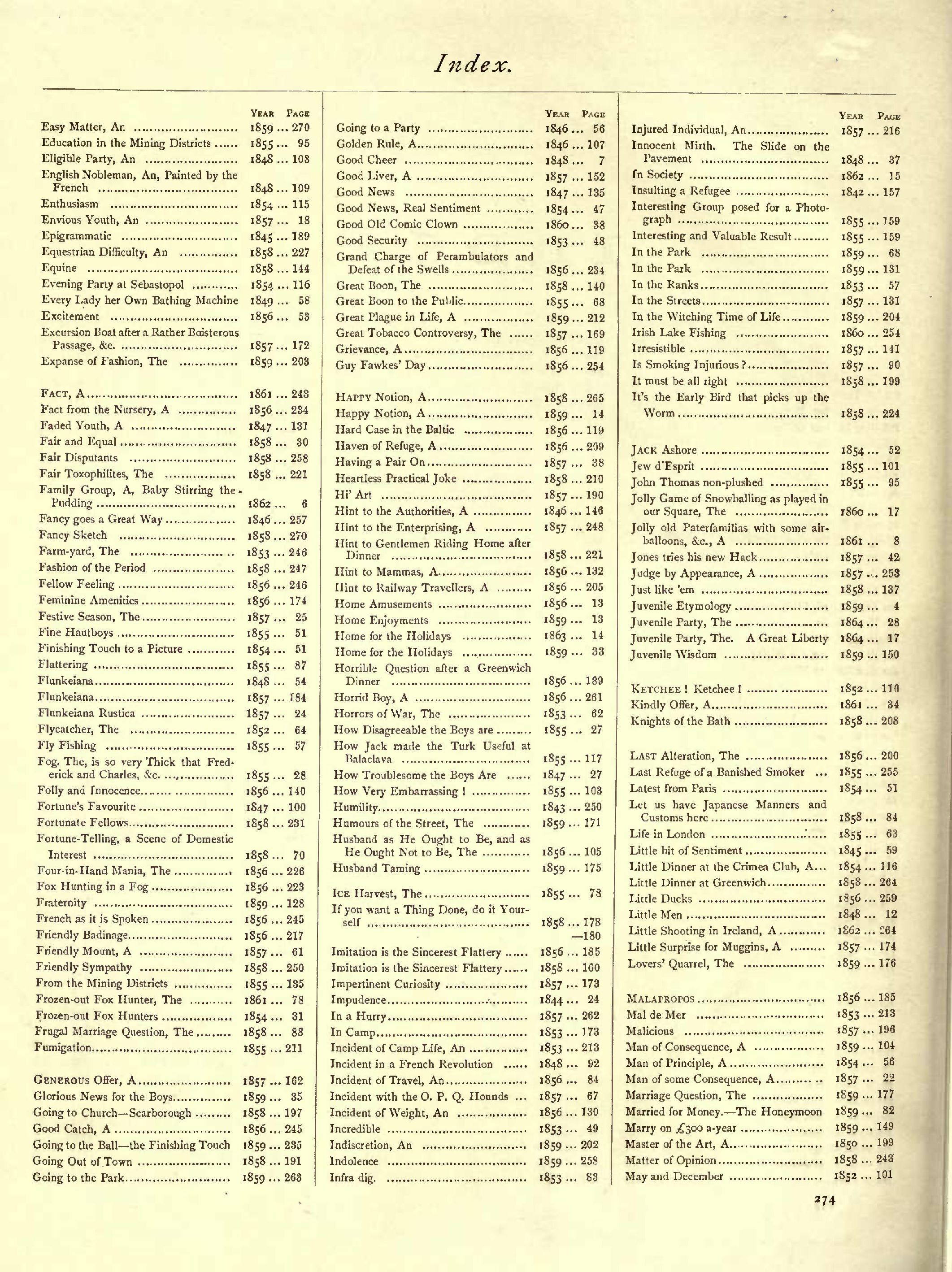 Eager Applicants..,....................................1854...039 Early Philosophy ......................................1847...112 Easier Said than Done..................................1856...239 East Wind Joke, An ....................................1855...255 Easy Matter, An .......................................1859...270 Education in the Mining Districts......................1855...095 Eligible Party, An ....................................1848...103 English Nobleman, An, Painted by the French ...........1848...109 Enthusiasm ............................................1854...115 Envious Youth, An .....................................1857...018 Epigrammatic ..........................................1845...189 Equestrian Difficulty, An .............................1858...227 Equine ................................................1858...144 Evening Party at Sebastopol ...........................1854...116 Every Lady her Own Bathing Machine.....................1849...058 Excitement ............................................1856...053 Excursion Boat after a Rather Boisterous Passage, &c...1857...172 Expanse of Fashion, The ...............................1859...203