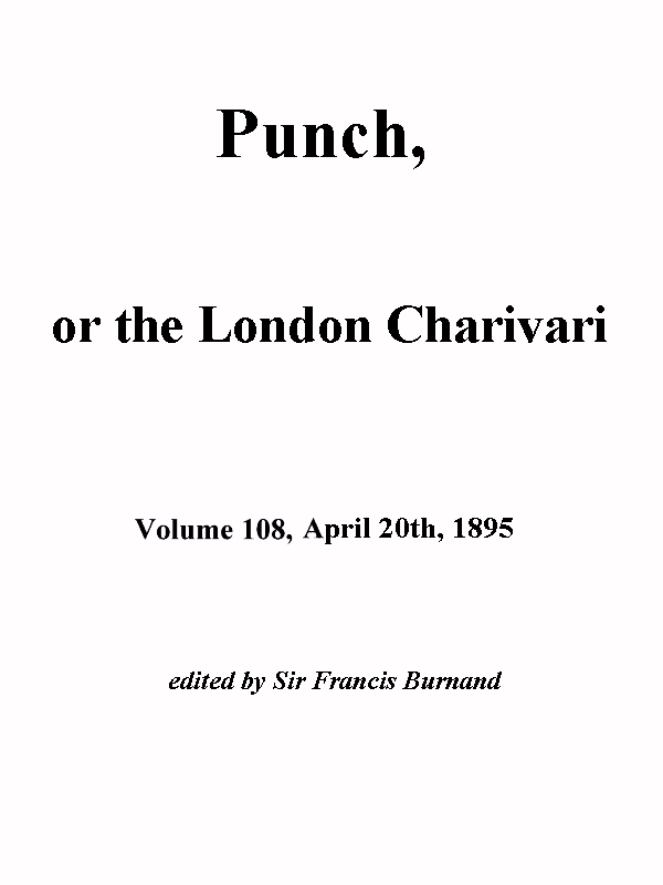 The Project Gutenberg EBook of Punch, or the London Charivari, Vol. 108, April 20, 1895, by Various This eBook is for the use of anyone anywhere at no cost and with almost no restrictions whatsoever. You may copy it, give it away or re-use it under the terms of the Project Gutenberg License included with this eBook or online at www.gutenberg.org Title: Punch, or the London Charivari, Vol. 108, April 20, 1895 Author: Various Editor: Sir Francis Burnand Release Date: January 19, 2014 [EBook #44707] Language: English Character set encoding: ISO-8859-1 *** START OF THIS PROJECT GUTENBERG EBOOK PUNCH, CHARIVARI, APRIL 20, 1895 *** Produced by Malcolm Farmer, Lesley Halamek and the Online Distributed Proofreading Team at http://www.pgdp.net