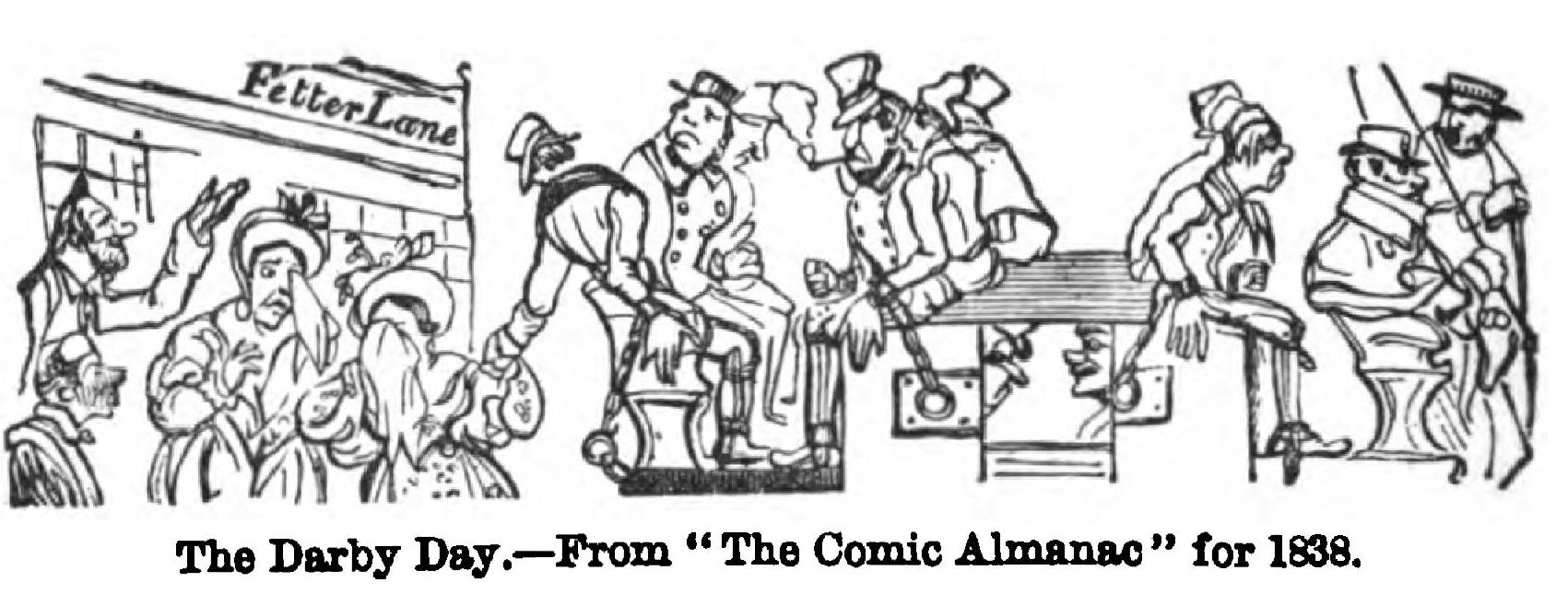 Guys in council over the gunpowder plot May now famishes the artist with one of his happiest bits of suburban scenery, “all a-growing,”—a housewife exchanging old garments for spring flowers; and now such a crowd of lean-shanked charity boys, with such a beadle as only the “inimitable George” could draw before Leech’s time, are beating the bounds. July furnishes a whimsical scene of the dog-days—with London dogs fighting, drawing carts, playing Toby in a Punch and Judy show, running under a truck, and an aristocratic dog looking haughtily down from a first-floor window. (Landseer took more than one hint from Cruikshank’s animals.) June “down at Beulah,” a December dance; May “settling for the Derby”—a wonderful assemblage of broad and long faces; July at the seaside, with cockneys donkey-riding—“long days and long ears;” a November fog; December—“a swallow at Christmas,” a procession of the many substantial items of Christmas cheer, making a procession into the prodigious maw of John Bull. The fountain of humour is inexhaustible. The satirical contrasts also, are capital. Premium, a smart gentleman, with the ladies smiling upon him; Discount, in the dumps, and shabby, with the ladies’ backs resolutely turned towards him. The Parlour and the Cellar, each getting drunk after its fashion. The “Shop and the Shay,” two delightful bits of London life. Then there is the British Museum in 2043, with a gibbet, the pillory, a stage coachman, a Whig, a Tory, and a tax-gatherer’s book among the curiosities.