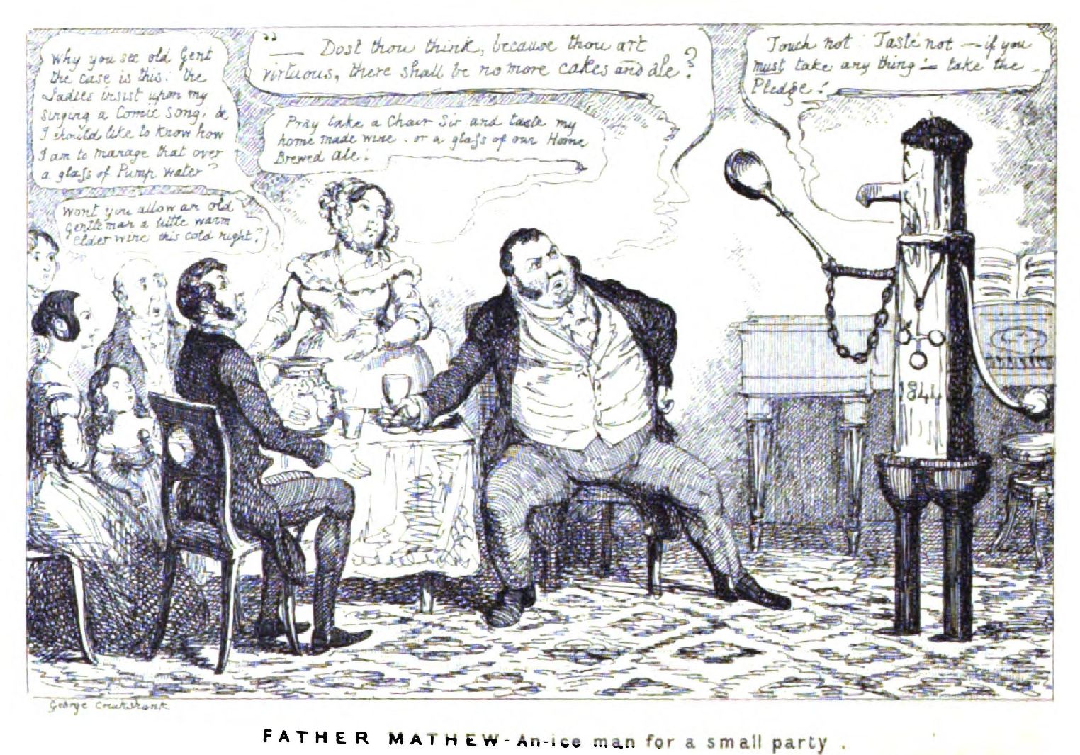 In the Almanac which included the Guy Fawkes cartoon appeared Cruikshank’s Father Mathew, a nice man for a small party. Father Mathew appears in the shape of a pump or filter to a convivial domestic circle, and holds parley with them. The animated pump, with the extended handle for a warning arm, and the spout for a nose, is an old Cruikshankian figure. “Touch not—taste not,” says the preacher-pump: “if you must take anything, take the Pledge.”