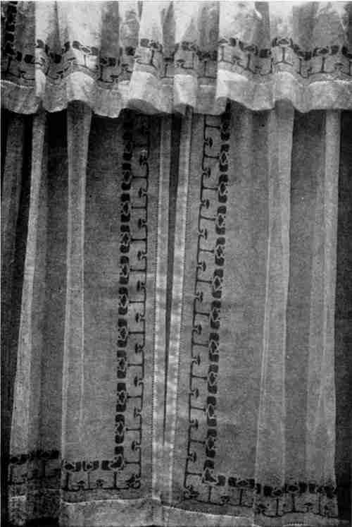 Advantage of Plain Walls.—Decorative designs, however, are not essential in wall papers. The main point in the treatment of walls is to secure and preserve a good background. If one is in doubt as to the kind of figure or pattern to be used, which is often a perplexing question, it is well to leave them out altogether. Plain walls are always good if the colour tone is right; for colour is the main thing in wall decoration. The decorative effects of form may be brought out in the portières and window draperies, which may easily carry more elaborate patterns when associated with plain walls than is desirable with figured wall decorations. In fact, with figured walls plain portières and curtains are much to be preferred. In our model house, as has been explained, the wall decorations were designed to offer a plain background of colour. The figured borders of the portières and curtains, combined with the careful gradation in the colouring of the floors, wall spaces, and ceiling, gave such a variety of tone to this background that nothing further was needed to avoid monotony.