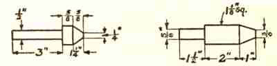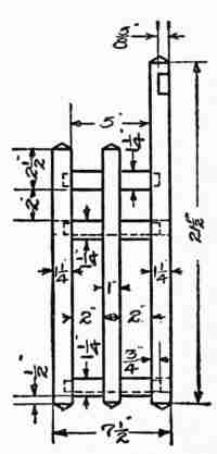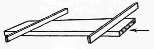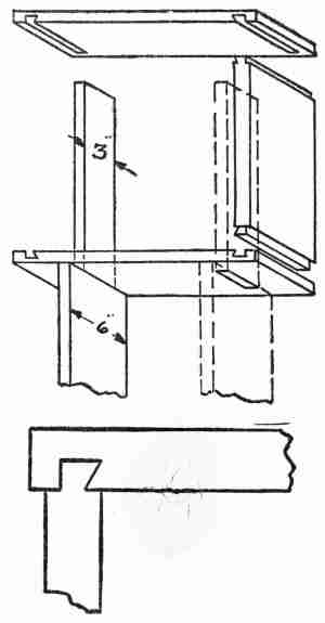 Setting Batter Boards, Posts, and Sills.—The first step in actual construction was to mark off the lot and set the batter boards. These were made by driving three stakes to form a right angle about four feet from the point where each of the four main[26] corners of the house was to be located. Two rough boards, one for each side of each angle, were nailed horizontally to each of the four sets of stakes, with their upper edges all brought to the same level. It is very important to set these batter boards with accuracy, since their function is to carry the lines which mark the dimensions and level of the ground floor. In the present instance their first use was to locate the concrete posts on which the sills of the house were to rest. Twenty-two of these posts, which were 4 feet long and 8 inches square, were put in position by first setting moulds or boxes, the interior dimensions of which were those of the posts, 3 feet deep in the light soil and filling them with a mixture of concrete and crushed rock. It was not thought necessary to remove the moulds after the hardening of the concrete. In fact, the sills were framed and placed in position resting on these boxes before sufficient time had been given for the concrete to harden. The sides of the boxes, however, were scored with a saw cut so that they could be easily broken off just below the ground, exposing the projecting ends of the concrete posts for about one foot. The sills were of 6 by 8-inch first quality spruce. They were set on the 6-inch face, the two long sills being spliced over posts,[27] using a long halved joint. Mortise and tenon joints, draw-bored and pinned, were used at the corners. The floor timbers of 2 by 8-inch spruce were gained into the sills with the top faces flush with the top of the sill and crowning (i. e., bending) upward if at all. The spacing of the floor timbers was taken off at the sill on a strip of furring—spruce, 7⁄8 of an inch thick by 2 inches wide—which was moved out to the centre near the line of bridging and lightly nailed, bringing crooked timbers into line. The bridging was then nailed in, the outside last to prevent springing the sills.