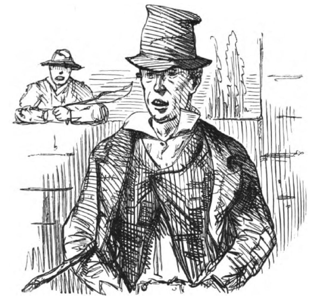 We saw nothing at all suggestive of a shindy until (to our great joy) we met a couple of our college friends, Hoare, the stroke of our boat, tall among the tallest, as Arba among the Anakims, arm in arm with little Dibdin, the coxswain (they have been sworn friends, ever since Hoare took him by the collar, and dropped him into the Isis, for some mistake in steering); and these gentlemen were armed with shillelaghs, and anxious, as the old lady in the captured city, to know when the fun would begin. “For now I see,” said Hoare,—