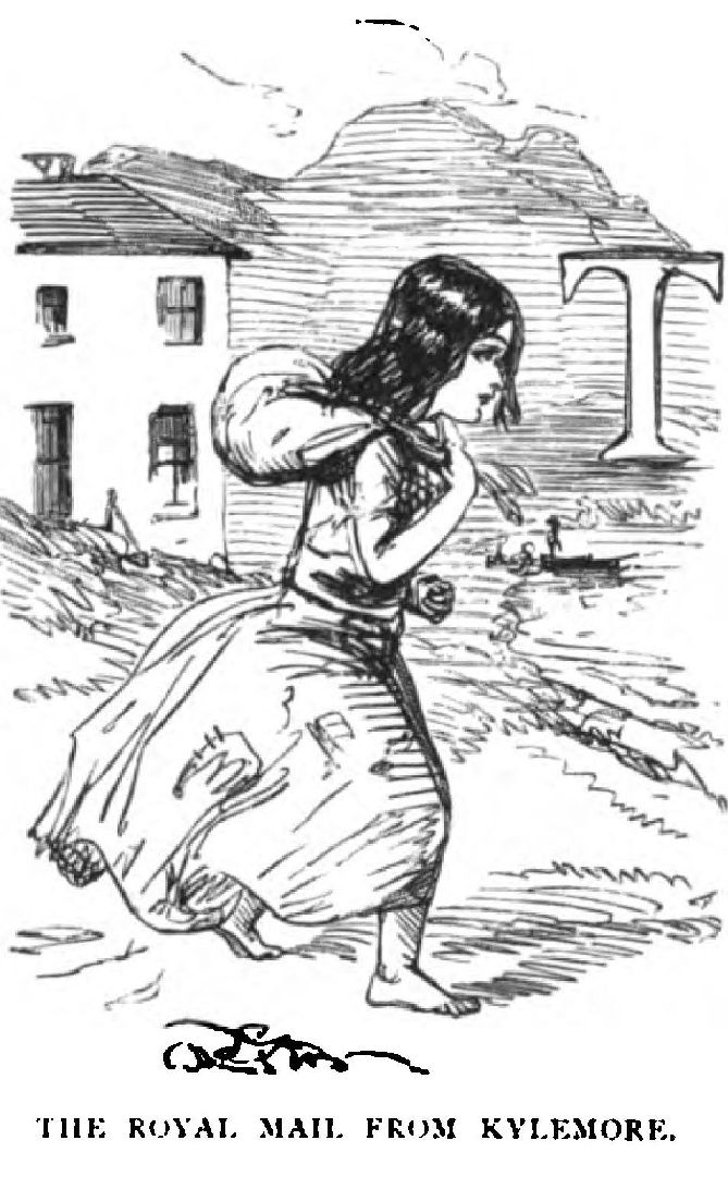 and cheers his loneliness with the thought, that should Galway become (as all who care for Ireland must hope) the port for America, this solemn stillness shall depress no more. The inn forms one side of the principal Square, and, the neighbour buildings being comparatively small and dingy, resembles some grand lady, in all her crinoline, teaching the third class at a Sunday school. The grass-plat and garden are nicely kept, but their chief ornaments struck us as being rather incongruous, to wit, hydrangeas and cannon! The guns were pointed at our bedroom windows, and it really required some little resolution next morning to shave ourselves with placidity “at the cannons' mouth.” Having secured places for the morrow on the Car to Clifden, specially stipulating for “the Lake side” of the conveyance, we selected a shrewd-looking lad from a crowd of candidates (the Roman candidati wore white togas in the market-place, but these young gentlemen did not), and went to see the sights. We saw a great deal that was very interesting, and a great deal that was very dirty; we saw the traces of Spanish architecture, in quaint gateways and quadrangular courts, but were not “reminded of Seville,” our only association with that city being a passionate love of marmalade; we saw Lynch's castle, and its grotesque carving is very curious; we saw the house in Deadman's Lane, where lived that Fitz-Stephen, Warden of Galway, who, according to the worst authenticated tradition, assisted at the hanging of his own son; we saw warehouses sans ware; granaries, some without grain, and others with “the meal-sacks on the whitened floor;” we saw and greatly admired Queen's College; we saw chapels and nunneries, whence the Angelus bell sounded as we passed; above all, we saw the Claddagh. Going thither, our little showman told us of the big trade in wines between this place and Spain which flourished in the good times of old, and I foolishly thought to perplex him by the inquiry, “whether much business was done in the Spanish juice line?”