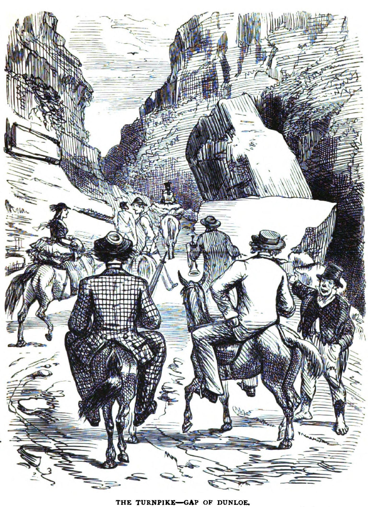 “Sure, gintlemen,” said he, “and I'm for th'ould style intirely—it's illigant. I tell ye what it is, yer onners,” (and he turned to us in impressive confidence, and pointed contemptuously with his whip at the offending vehicle) “I'd lep over the likes o' that with this little mare;” but we earnestly begged he wouldn't.