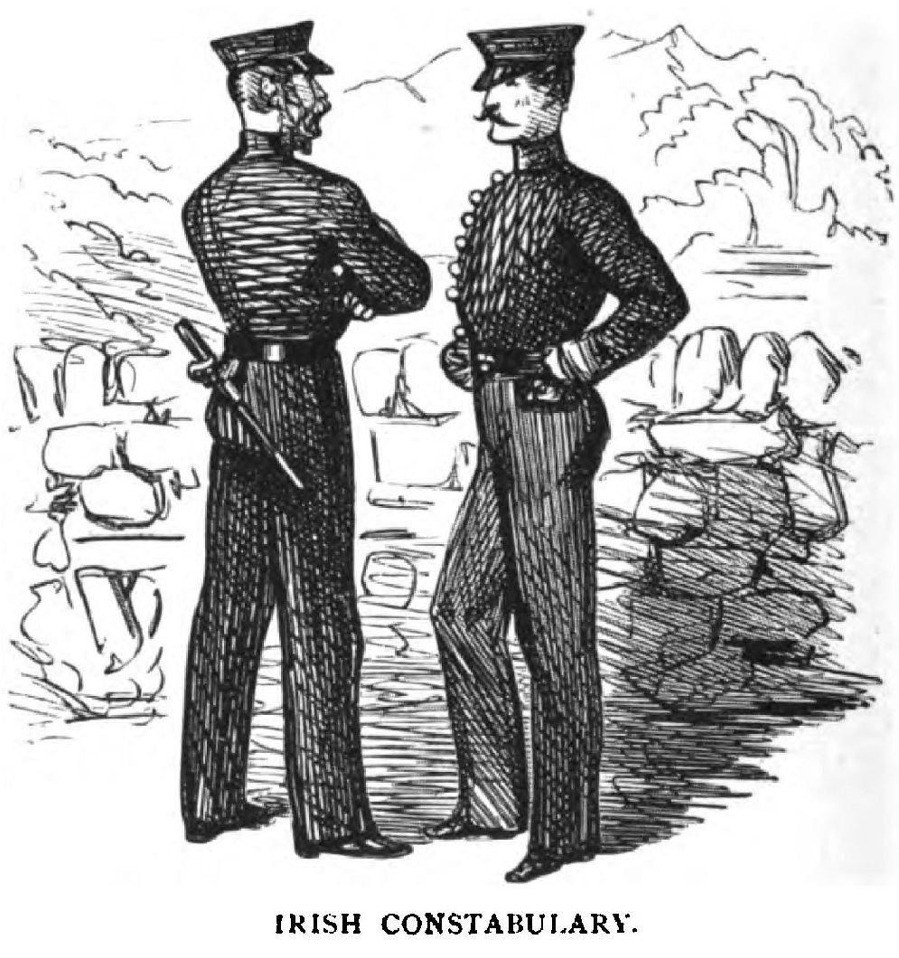 Progressing, we come to the Constabulary Barracks, where a couple of constables, with such moustaches as would make a young Cornet groan, are polishing up their carbines. Our London police are well-favoured in appearance, but if the Irish constables were to take their place, there would not be a single female-servant, to be “warranted heart-whole,” in the great Metropolis, and the very name of Meat-safe would become a by-word and a laughing-stock.
