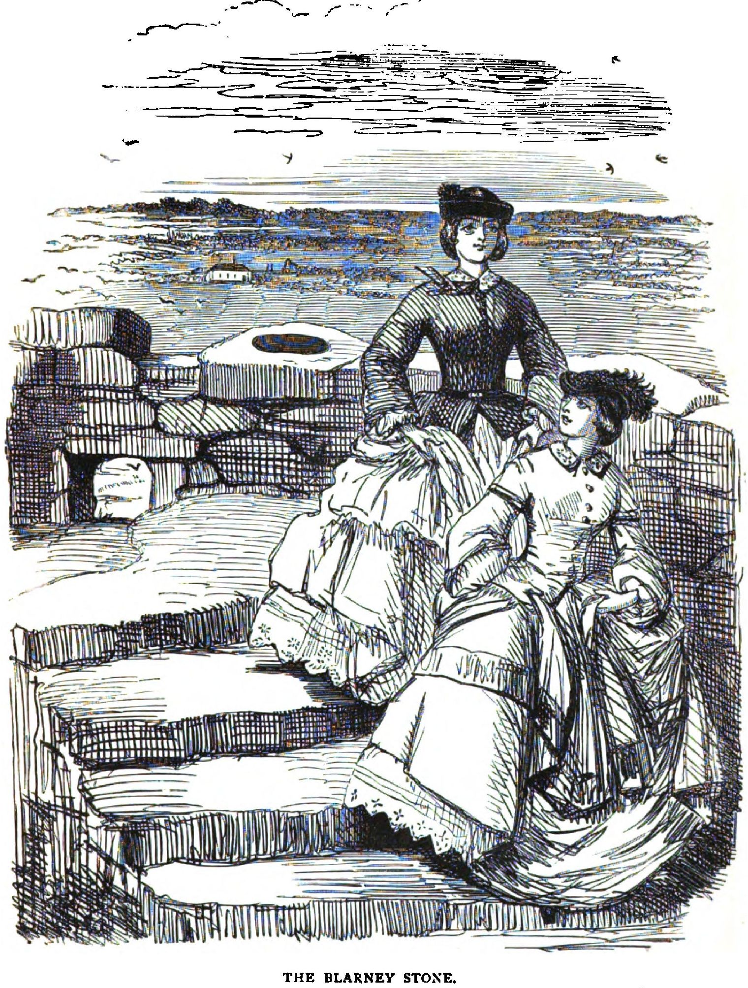 This is said to be the original Blarney Stone, but as no man could possibly kiss it, unless (as Sir Boyle Roche observed) he happened to be a bird, or an acrobat, twelve feet long, and suspending himself by his feet from the summit of the Tower, we were content to believe in the conventional granite, which now bears the name, and which, being situated at the top of one of the turrets, is very accessible for osculation.