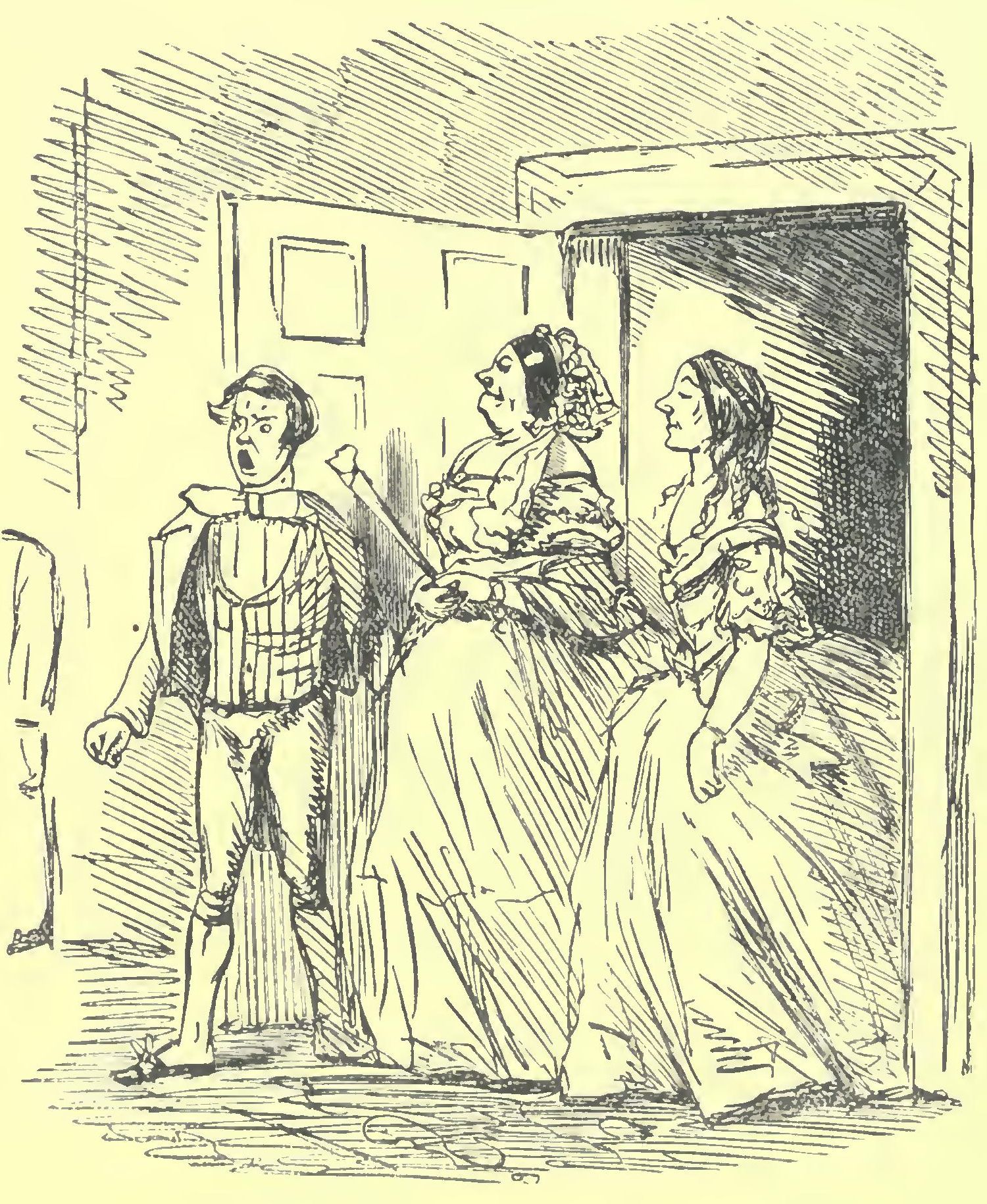THE room, as we said before, being crammed, and our fair friend Miss Willing taking some time to pass gracefully down the line of chair-backs, many of whose late occupants were now swinging their arms about in all the exertion of tying up their mouths, and fighting their ways into their over-coats, Mr. Pringle, as he followed, had a good opportunity of examining her exquisite tournure, than which he thought he never saw anything more beautifully perfect. He was quite proud when a little more width of room at the end of the table enabled him to squeeze past a robing, Dutch-built British-lace-vending pack-woman, and reclaim his fair friend, just as a gentleman does his partner at the end of an old country dance. How exultingly he marched her through the line of inn hangers-on, hostlers, waiters, porters, post-boys, coachmen, and insatiable Matthews-at-home of an inn establishment, “Boots,” a gentleman who will undertake all characters in succession for a consideration. How thankful we ought to be to be done with these harpies!