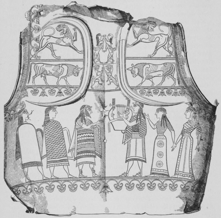The Hallstatt civilizations betray unmistakable affinities with three other prehistoric European cultures, widely separated from one another. It contains many early Greek elements; it is very similar to a notable prehistoric culture in the Caucasus Mountains; and it resembles most nearly of all perhaps the pre-Etruscan civilization in Italy. With the third of these—the Italian—it seems to have been most nearly upon terms of equality, each borrowing from the other, after a fashion of which we shall have occasion to speak shortly. On the other hand, the relation of the Hallstatt culture to that of Greece and Caucasia seems to be somewhat more filial rather than fraternal. In describing the area of this civilization, we have seen how firmly it is intrenched all through the southern part of Austria-Hungary and well over into the north of the Balkan peninsula. A comparison of Furtwaengler's magnificent collection of objects from Olympia with those of Hallstatt instantly reveals their similarities. To make this[Pg 23] clear, we have reproduced one of the Olympian breastplates, ornamented with figures, which at once suggest those upon the situla from Watsch above described. This design is doubly interesting. It shows us a slightly higher stage of the art of figural representation, as well as of conventional design. Not only the men and horses, but the borders, are far better drawn. More than this, we begin to detect a distinctly Oriental motive in other details. The bulls and the lions—lions are not indigenous to Europe nowadays—at once remind us of their Babylonian and Assyrian prototypes. We have entered the sphere of Asiatic artistic influence, albeit very indistinctly. This design here represented, it should be said, is rather above the average of the Olympian finds of the earlier epoch. Many of the other objects, especially the little votive figures of beasts and men, are much more crude, although always characteristic and rudely artistic in many ways. Through this Olympian stage of culture we pass transitionally on to the Mycenæan, which brings us into the full bloom of the classic Greek.