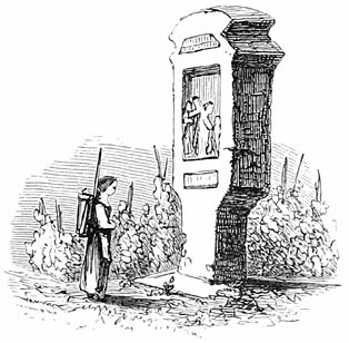 Back from the train of old history our thoughts return as the evening closes in by the source of our sweet river, and we bend our steps down through the dim woods. The white butterflies flap past, heavily, as though feeling the last moments of their short lives are fleeting fast; frequently above our heads starts out a projecting mass of rock, from whose summit a great [11]pine towers up, first leaning forward, then shooting upwards, its top seems piercing the blue sky.