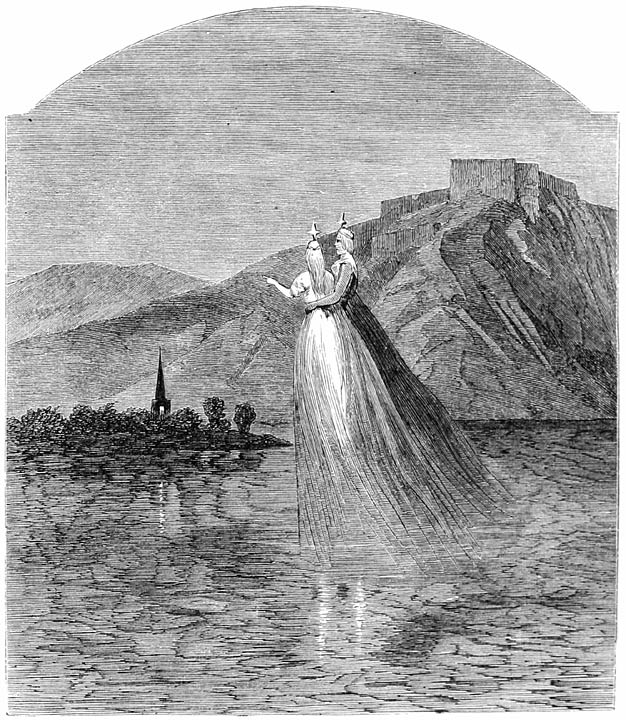 Now come the mountains, too, with their crowns of forest waving on their heads, and do homage to her beauty: [5]she gives a sweet smile to all, lingering at every turn to look back upon her friends; but yet she tarries not, her duty leads her on,—nor worldly pomp, or pride, or power, can keep her from her appointed path; she leaves them all behind, and swelling onwards through the level plain, receives the approving glance of heaven, and meets her noble husband Rhine, who, long expecting, folds her in his arms. And thus her pilgrimage complete, her duty ended, she calmly sleeps that happy sleep which wakes only in eternity.