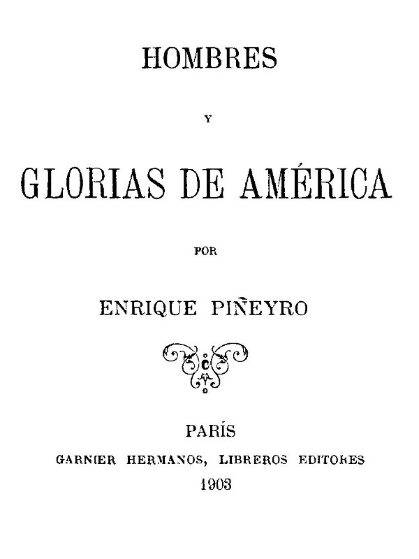 Project Gutenberg's Hombres y glorias de América, by Enrique Piñeyro This eBook is for the use of anyone anywhere at no cost and with almost no restrictions whatsoever. You may copy it, give it away or re-use it under the terms of the Project Gutenberg License included with this eBook or online at www.gutenberg.org/license Title: Hombres y glorias de América Author: Enrique Piñeyro Release Date: February 15, 2014 [EBook #44918] Language: Spanish Character set encoding: ISO-8859-1 *** START OF THIS PROJECT GUTENBERG EBOOK HOMBRES Y GLORIAS DE AMÉRICA *** Produced by Carlos Colón, Adrian Mastronardi and the Online Distributed Proofreading Team at http://www.pgdp.net (This file was produced from images generously made available by The Internet Archive/American Libraries.)