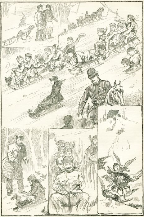 In a few minutes the back door banged to, and our lads ran down the slippery pathway toward the river, where the bright sails of the Tarrytown fleet were already gliding toward the hither shore, as if in challenge to a contest. A minute's steady trot brought the boys to the steamboat dock where the ferry-boat lay frozen in. A number of graceful ice-yachts were gliding hither and thither over the glassy surface, while several near the wharf stood with sails flapping in the crisp, freshening breeze, as numbers of men and boys hurried about making the last preparations for the race, while shouts and halloos resounded on all sides. An animated group was gathered about one large and very stanch-looking boat.