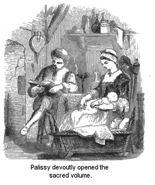 Was it any marvel if poverty and sorrow invaded his household; if his wife grew moody and sad, and if the neighbours, pitying the hapless woman and innocent children, pronounced hard judgment upon a man who consumed his time in buying pots and breaking them, in grinding drugs and burning them, and in going to and fro upon his bootless errand? Death, too, had once and again entered his doors, bearing away the two sickly infants we saw clinging to their mother, while in their place, two others had been born, inheriting, alas! their malady. Of late, Lisette, full of gloomy thoughts, had taken to complaining, and remonstrating with her husband. Her temper had been soured by disappointment and p. 43trouble; and hope, so long deferred, ceased to buoy up her spirit. She could not understand the course Bernard was pursuing. She did not partake in his glowing visions of future fame and prosperity, and the instinct of power and the energy of will that nerved and inspired him were all unknown to and unshared by her. Poor suffering woman! She felt as any other common-sense wife and mother would have felt in her circumstances; and bewailing his obstinate persistence in such profitless labour, she embittered his home by her lamentations and reproaches.