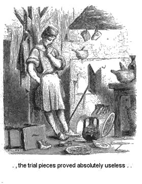 Some seven or eight months more were expended in making these vessels, and then he began to erect the furnace. With incredible difficulty and labour—for he had none to assist him in the work, not even so much as to draw water, and fetch bricks from the kiln—the indefatigable man wrought till he had completed the furnace, and the preliminary baking of his vessels. And then, instead of reposing after all this toil, by the space of more than a month, he worked, night and day, grinding and compounding the materials of which he had made the white enamel. At length his task was completed, and the vessels, coated with the mixture, were arranged within the furnace.