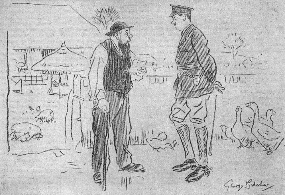The one seated (reading newspaper of January 29th). "'20,000 GERMANS FALLEN IN ATTEMPT AT COUP-DE-MAIN.' Can yer see it? C-O-U-P., D-E., M-A-I-N. Stick a Union Jack in there."