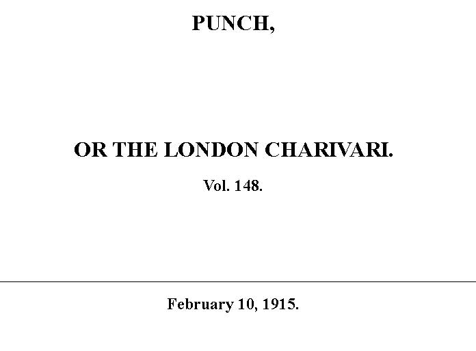 Extract from a Book Merchant's Catalogue:—"I venture to assert no more acceptable gift could be sent to our Heroes on Active Service than a few cwts. of Literature. A book is the best of all companions and always useful, for one in the breast pocket has been the means of saving many a man's life in action." A Society for supplying every recruit with a complete set of The Encyclopædia Britannica is now, we believe, in process of formation.