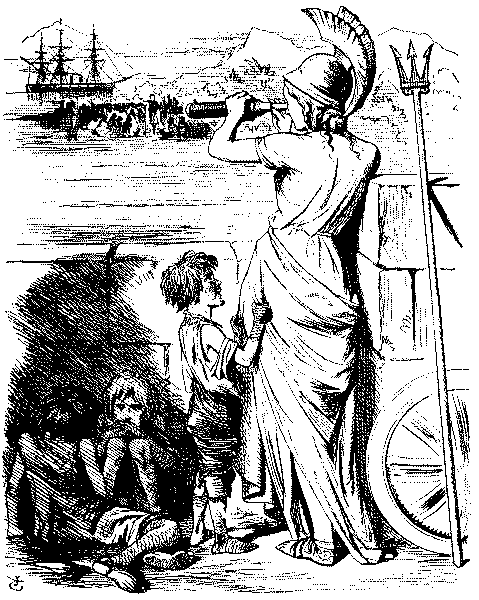 So along with appeals to Lord Derby to make up his mind like a man to Reform, we find repeated and even more urgent appeals to England to keep up the Channel Fleet. The imposing[Pg 10] display of force at Cherbourg by Louis Napoleon in the autumn of 1858 only enhanced Punch's misgivings and prompted the suggestion of an alliance with the United States. Punch greeted Sir Francis Head's renewed scare-mongering about a French invasion with ridicule, but he was more seriously impressed by French pamphleteers and novelists who spoke of war with England as inevitable.
