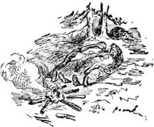 We found on the point of land and down near the water’s edge, a shelter of canvass and pine boughs, a Dutch oven, tin cans empty and full, an old pair of boots, some fishing tackle and other evidences of man’s presence. Besides there was a boat and a couple of rafts moored to the beach and a fish box anchored a short distance out. We contented ourselves with looking over these desecrations, which had on first view taken nine-tenths of the romance out of the picture, and walked back to camp, intent only upon the quantity of trout we were to take out of the prolific depths.