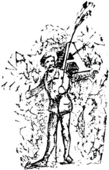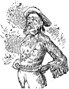 But I was better off than he. He had no John to console him with stories of leviathans caught by other rodsters “last summer.” John would scorn anything less than a three-pound trout to embellish his romances; five, six, and even nine pounds were evolved in his imagination. I took him for a Vermont Yankee, but it transpired that the Ozark Mountains claimed him for their own, without the prospect of any other place setting up a demand for him when he dies—if he ever does. He is tall and thin, has a stoop in his shoulders and slouches in his gait; his garments, such as he has, fit him—not so well as they would the clothes line; he has a Roman nose and gray eyes, he chews the fragrant “nigger head,” and his saffron-hued incisors habitually caress his nether lip. His mouth is always open, and his scraggy beard would vie in symmetry with a patch of hazel brush demoralized by a Kansas cyclone. A few days ago I wagered him a quarter that 133 he could not close his lips and keep them so three minutes. I won the bet, but have not yet realized upon it. John is a booley, fortunately for the rest of humanity.