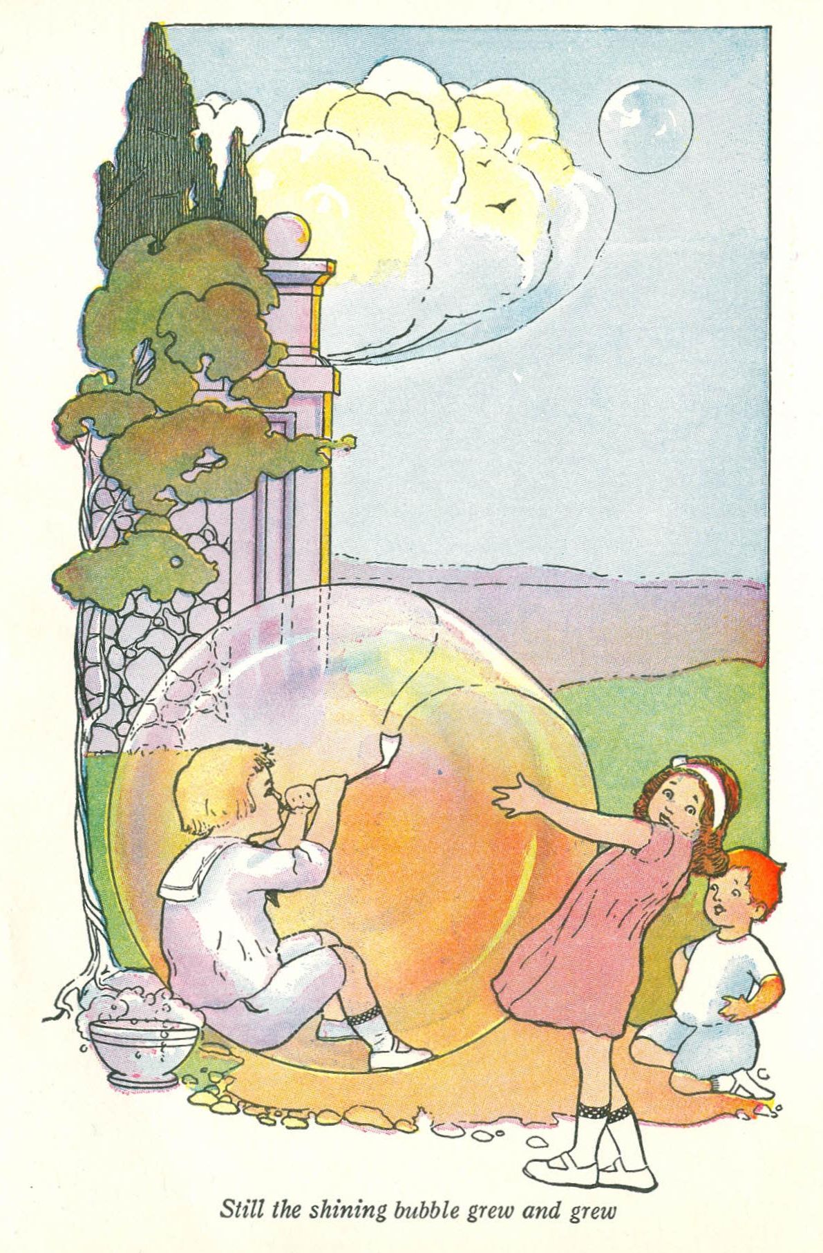 One day Bobbie and Betty and Billy were out in the garden blowing bubbles. They all blew bubbles, big ones and little ones, till evening came and it was almost time for tea. Then Billy said, “I can blow the biggest bubble anybody's blown to-day,” and blew a bubble as big as an apple.