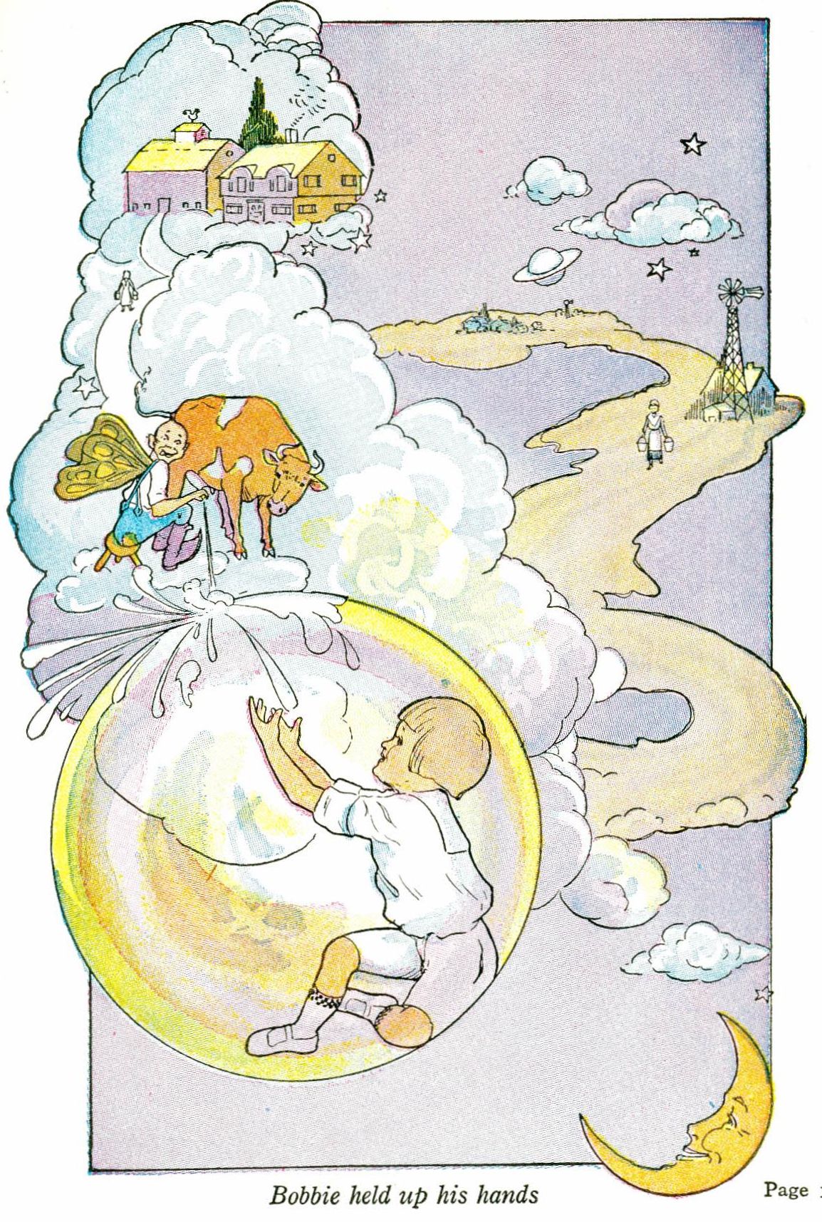 Up soared the bubble, and Bobbie soon saw that the clouds now formed themselves into a long, crooked roadway lined with little houses and barns and windmills. Tiny cows grazed on the fleecy pink clouds, like cows in a meadow of pink and white clover. And, strange to say, what had looked like stars were buttercups—golden buttercups.