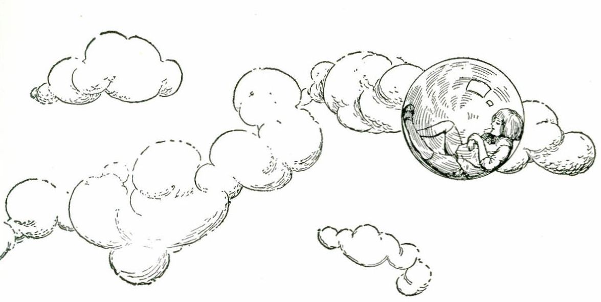 Over the trees they went, up toward the clouds. Bobbie looked down through the bubble and saw his house grow smaller and smaller. Soon the whole village was only a little dark speck.