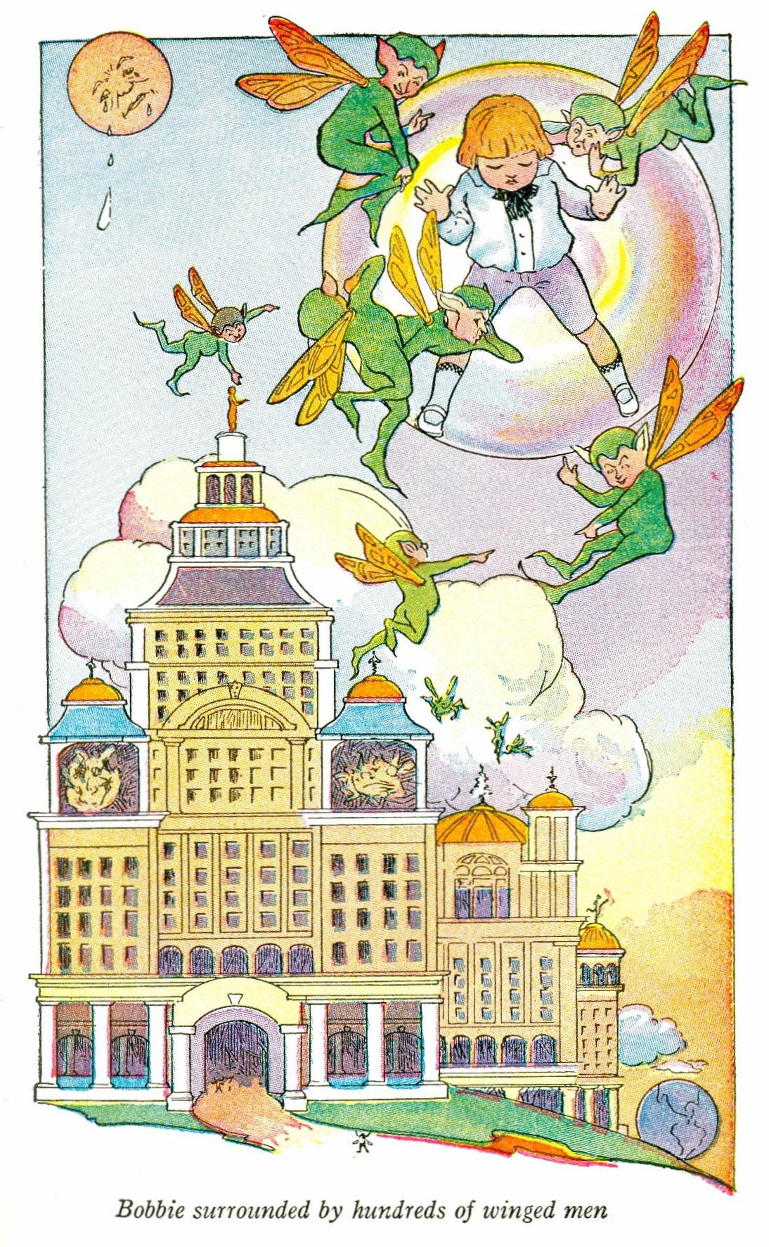 Away went the soldiers at double quick, and in a moment Bobbie was surrounded by hundreds of little winged men. They had large heads and queer faces; but fortunately, when they saw Bobbie and his frail little “world” they thought it a huge joke and quite forgot to look warlike. They seized the bubble, however, and soon Bobbie was hovering over a great building that reminded him of pictures of either the English House of Parliament or the New York Terminal, he couldn't remember which. Anyway, it was very large and very high.