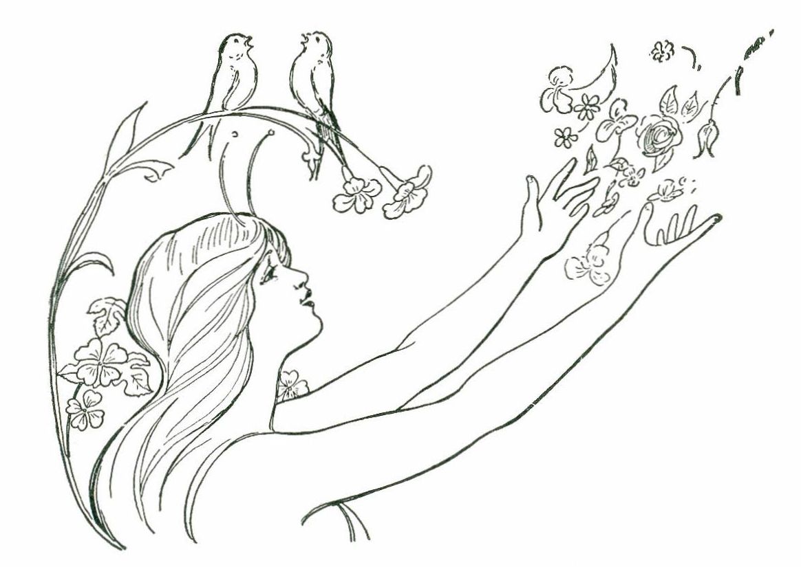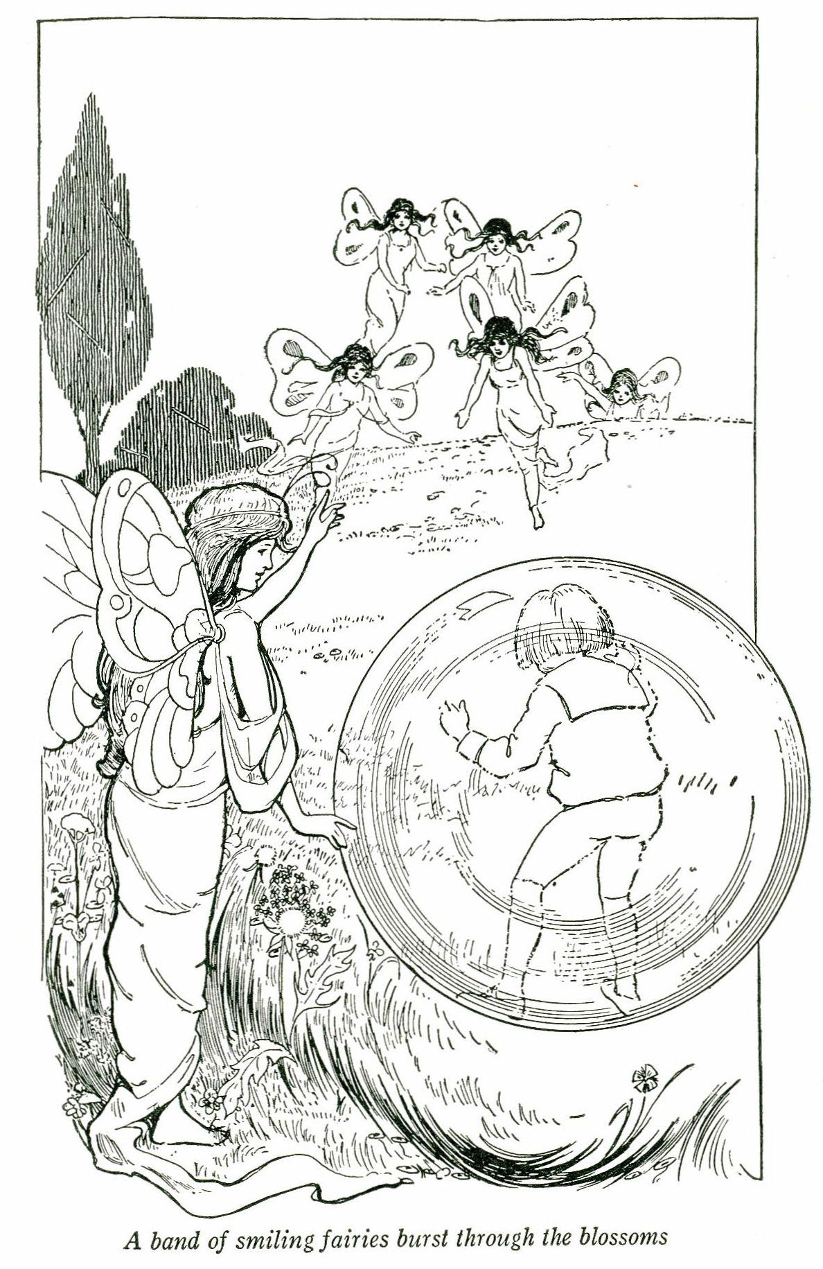 To Flowerland the wee fairy took Bobbie, and here were sights to gladden one's heart. As far as he could see, spread great beds of brilliant tulips and nodding columbine, towering flowers that Bobbie could not name, and delicate trailing vines. Bees and butterflies half hidden in the blossoms made fluttering bits of brightness. Beautiful dragon flies darted about, and Bobbie could hear the soft whir of the humming birds' wings, though all he could see of them was a gold-green flash as they darted from flower to flower. The air was sweet with perfume, and as Bobbie gazed about there suddenly burst through the blossoms a band of smiling fairies.