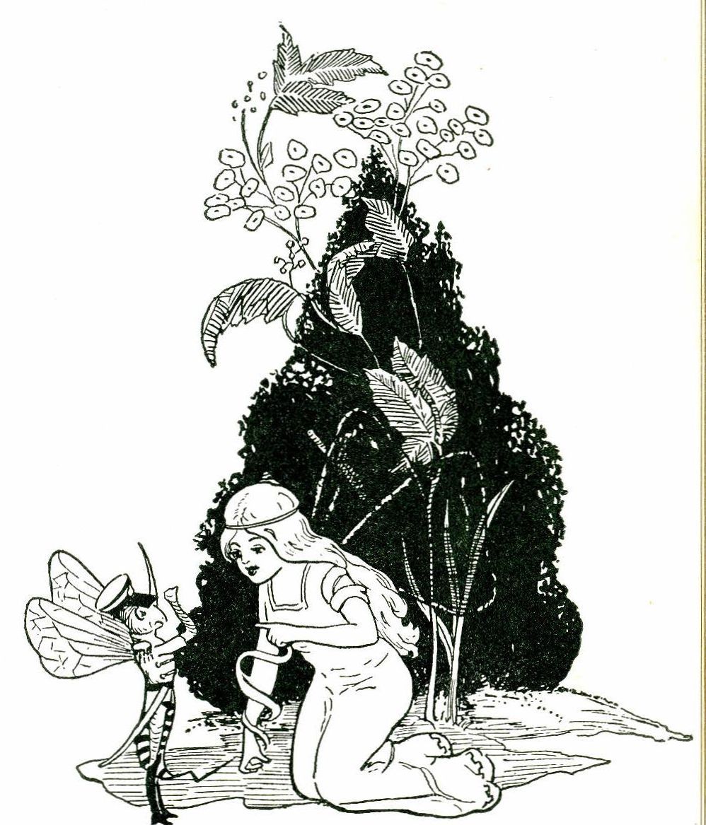 Half flying, half dancing, they circled round Bobbie and his fairy and led them to a tiny bower overhung with vines. In the center stood a great toadstool that served as a table, and around it smaller toadstool chairs. Upon the table was spread a wondrous banquet. There was honey in dainty flower cups, and the most delicious-looking food that Bobbie had ever seen. Gay-winged butterflies with lily-pad trays and little butler bees in smart striped waistcoats hovered about to serve the banquet.