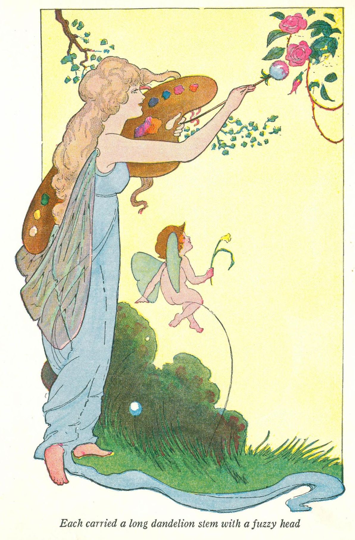 They hadn't gone very far when they met the four little Breezes frolicking in the air. They bobbed their heads up and down three times out of respect to the fairy queen, but all the time they were looking out of the corners of their eyes at Bobbie.