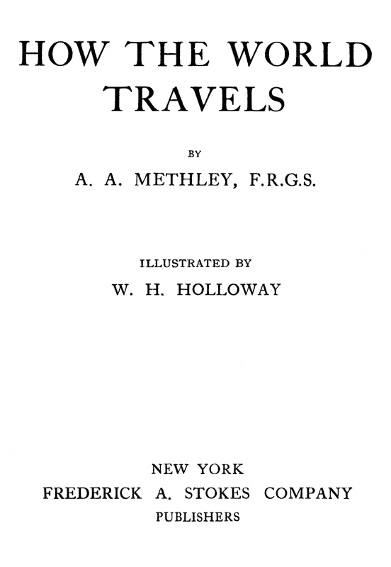 The Project Gutenberg EBook of How the World Travels, by A. A. Methley This eBook is for the use of anyone anywhere at no cost and with almost no restrictions whatsoever. You may copy it, give it away or re-use it under the terms of the Project Gutenberg License included with this eBook or online at www.gutenberg.org Title: How the World Travels Author: A. A. Methley Illustrator: W. H. Holloway Release Date: March 8, 2014 [EBook #45078] Language: English Character set encoding: ISO-8859-1 *** START OF THIS PROJECT GUTENBERG EBOOK HOW THE WORLD TRAVELS *** Produced by Chris Curnow, Mary Akers and the Online Distributed Proofreading Team at http://www.pgdp.net (This file was produced from images generously made available by The Internet Archive)