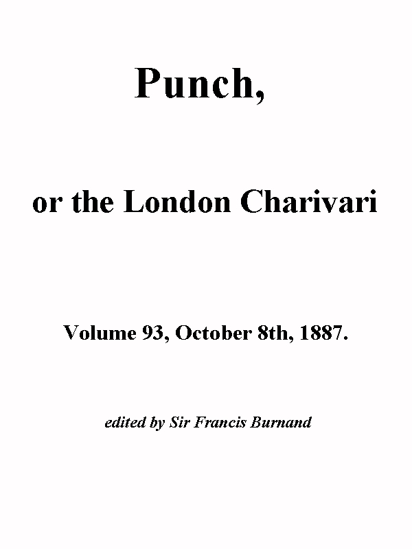 The Project Gutenberg EBook of Punch, or the London Charavari, Volume 93, October 8, 1887, by Various This eBook is for the use of anyone anywhere at no cost and with almost no restrictions whatsoever. You may copy it, give it away or re-use it under the terms of the Project Gutenberg License included with this eBook or online at www.gutenberg.org Title: Punch, or the London Charavari, Volume 93, October 8, 1887 Author: Various Editor: Sir Francis Burnand Release Date: March 9, 2014 [EBook #45087] Language: English Character set encoding: ISO-8859-1 *** START OF THIS PROJECT GUTENBERG EBOOK PUNCH, CHARIVARI, OCTOBER 8, 1887 *** Produced by Credits line so far: Punch, or the London Charivari, Lisa Tang, Malcolm Farmer and the Online Distributed Proofreading Team at http://www.pgdp.net