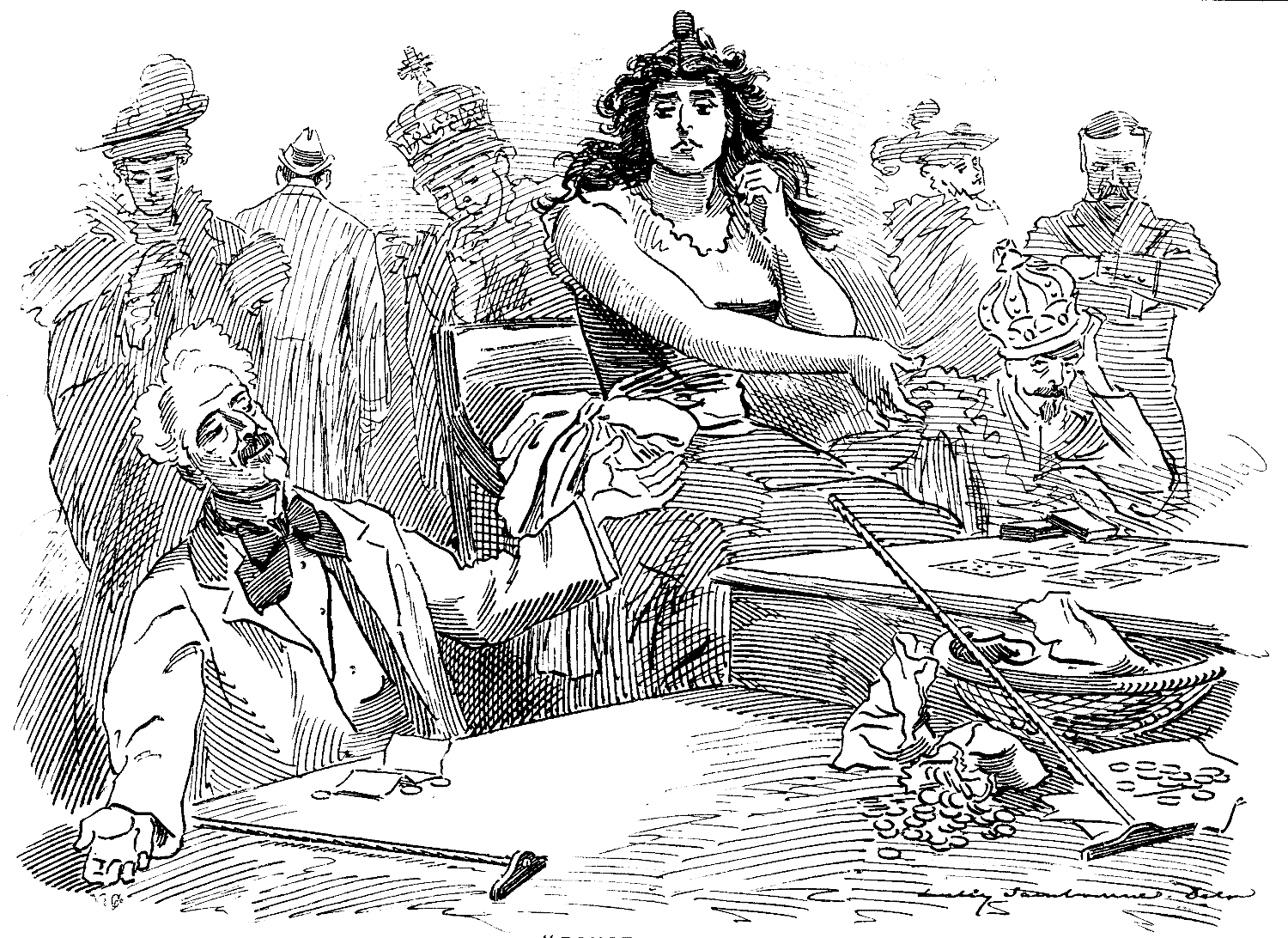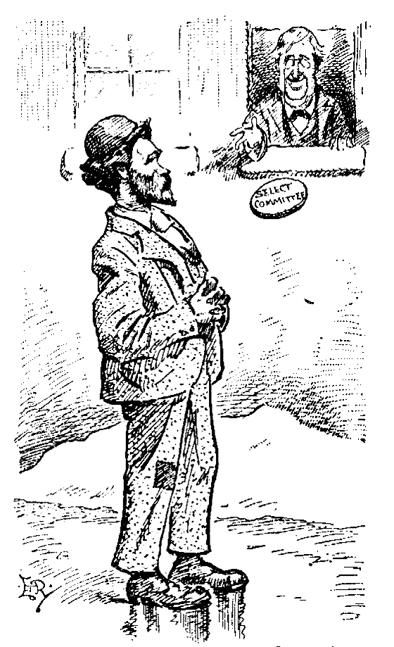 Chaplin viewing state of things depressing industrial communities admitted it was very bad. Mills closed, mines empty, ship-building yards silent, workmen starving. Only one thing would save the State—Bimetallism. "Is there anyone," said the orator with magnificent wave of arm round desolate benches; "who has any other suggestion to make for the salvation of these industries?" Then up spoke Jemmy Lowther. "I have," he said with final tug at the blade of the knife hidden in his pocket.