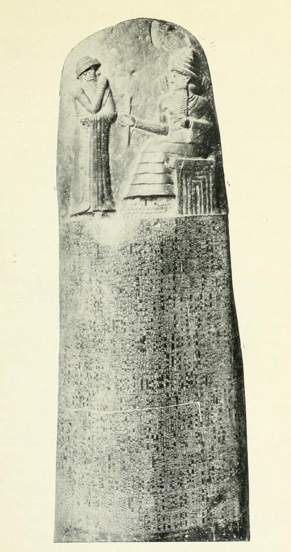 Basalt Stele engraved with the Text of Khammurabi's Code of Laws. The scene represents the King receiving the Laws from Shamash, the Sun-god—Photo W. A. Mansell and Co.