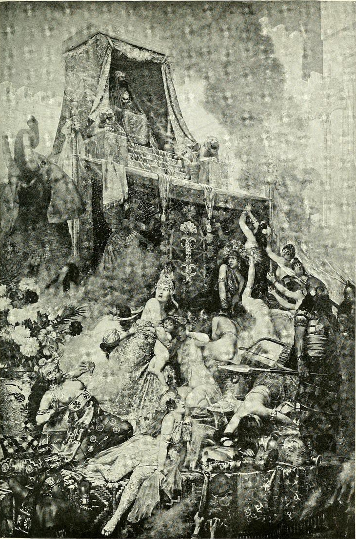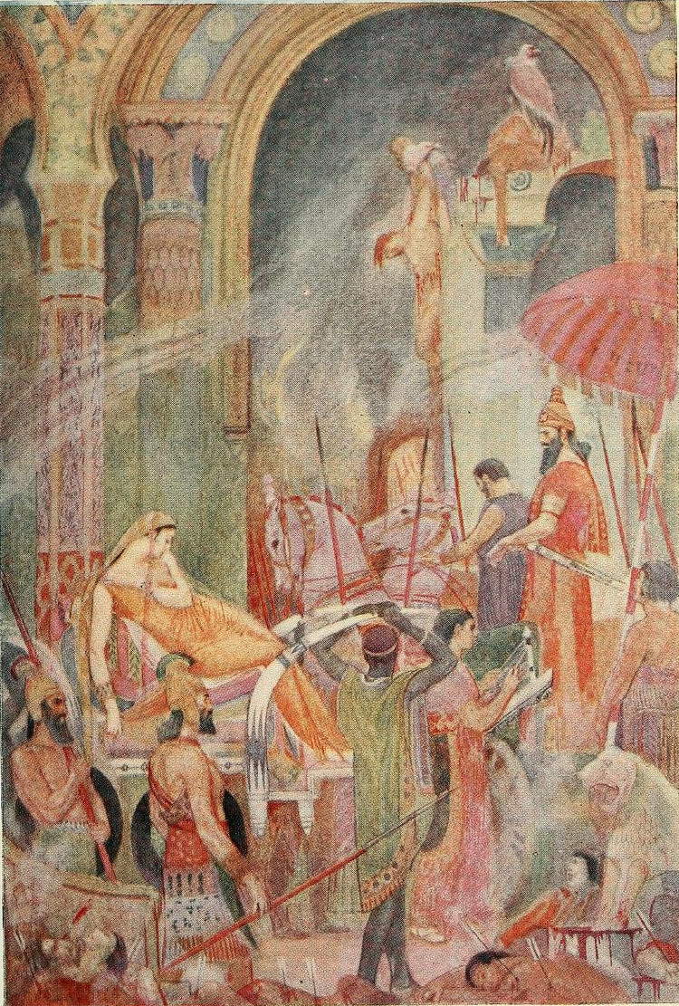 Esar-haddon was succeeded by Assur-bani-pal, known to Greek legend as Sardanapalus. How far the legendary description of him squares with the historical it is difficult to say. The former states that he was the last king of Assyria, and the thirtieth in succession from Ninyas. Effeminate and corrupt, he seems to have been a perfect example of the roi fainéant. The populace of the conquered provinces, disgusted with his extravagances, revolted, and an army led by Arbaces, satrap of Medea, and Belesys, a Babylonian priest, surrounded him in Nineveh and threatened his life. Sardanapalus, however, throwing off his sloth, made such a vigorous defence that for[Pg 32] two years the issue was in doubt. The river Tigris at this juncture overflowed and undermined part of the city wall, thus permitting ingress to the hostile army. Sardanapalus, seeing that resistance was hopeless, collected his wives and treasures in his palace and then set it on fire, so that all perished.