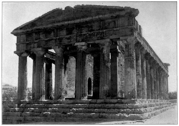 What Greek name the Concordia Temple had is unknown. Holm suspects that it is the temple of Demeter, although the substructure under a church farther up the hill has generally been assigned to her. It owes its excellent preservation to the fact that in the Middle Ages it was turned into a church of St. Gregory of the turnips, whoever he was, when the cella walls were perforated with a series of arches on each side, to let in the light.